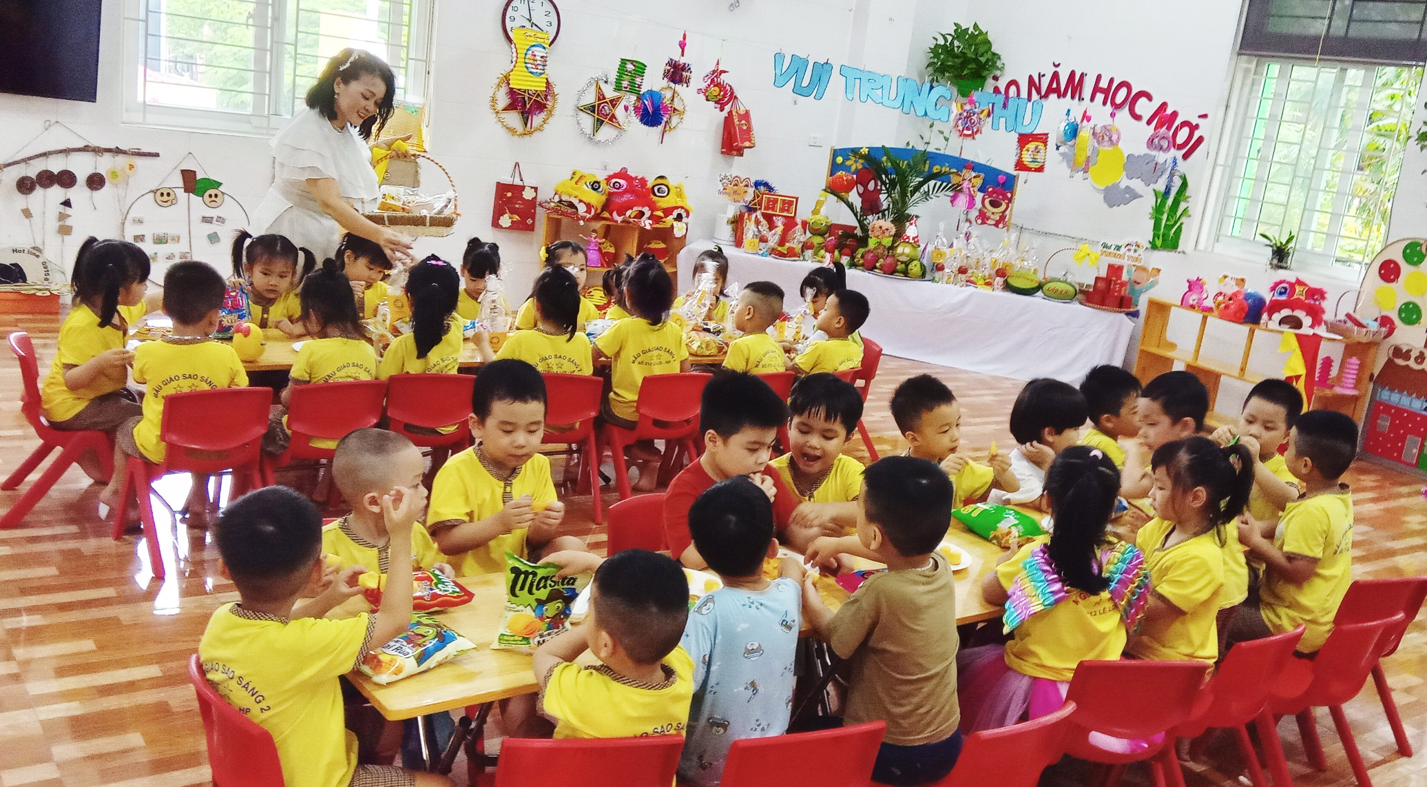 Mâm cỗ trung thu do các bé và cô trang trí đã hoàn tất.