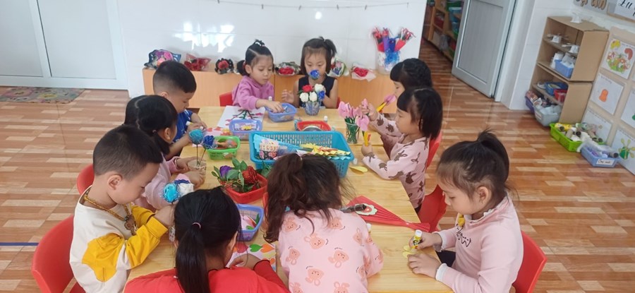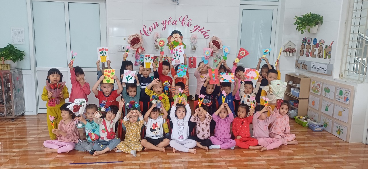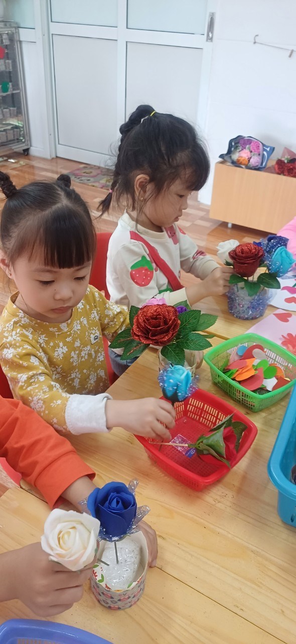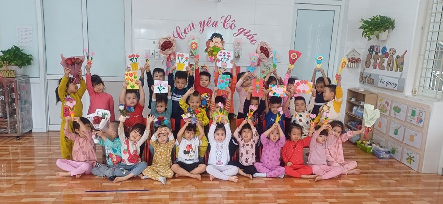 Trẻ cũng vui tươi phấn khởi khi đến trường, các hoạt động chào mừng ngày kỷ niệm của các cô được trẻ hào hứng tham gia, trẻ tự tay làm bưu thiếp để chúc mừng các cô.