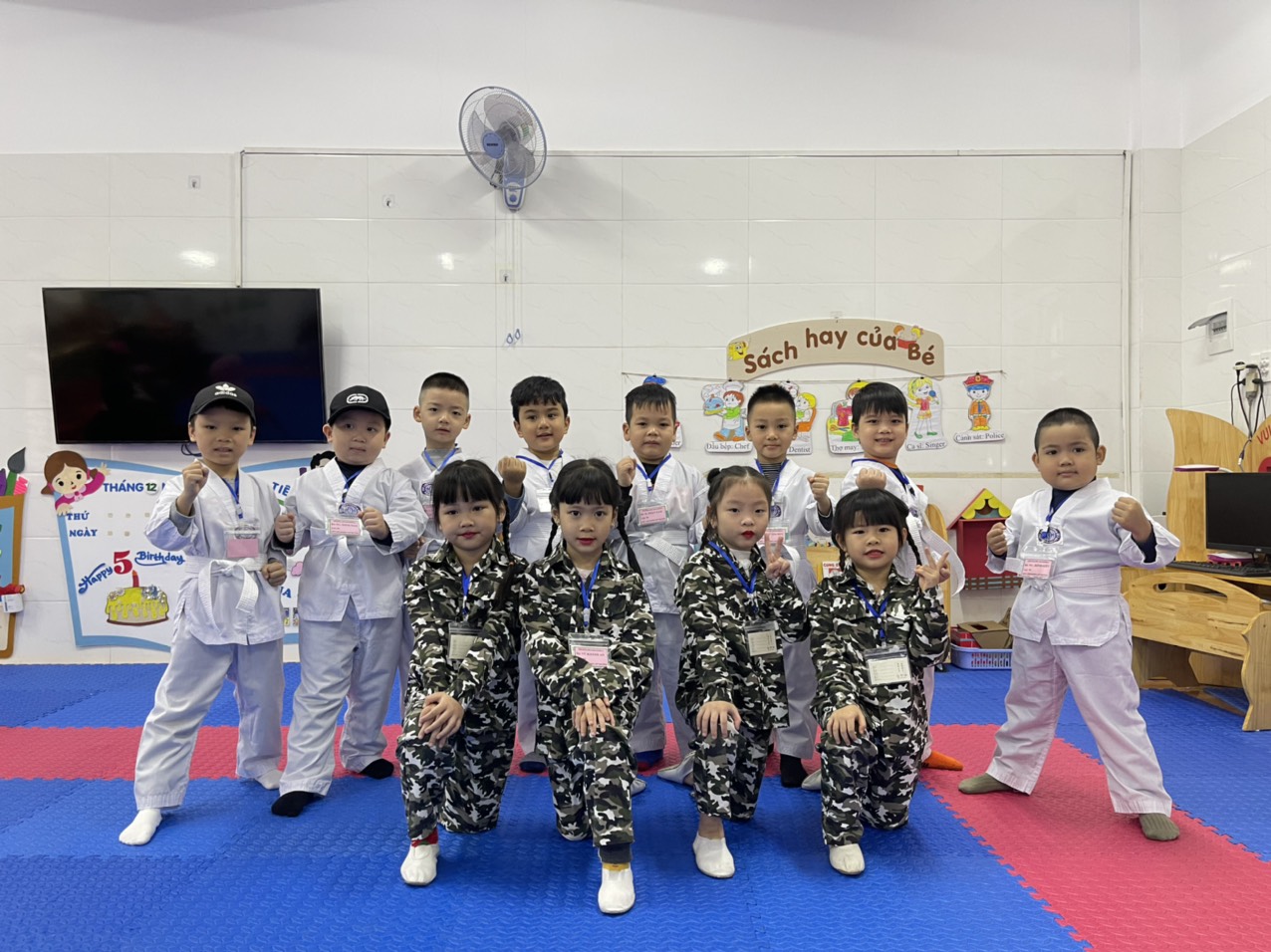 - Khi đi tham quan doanh trại quân đội và tham gia sân chơi: “ Chiến sĩ tí hon” các bé đã chơi các trò chơi tập thể như: Kéo co, đá bóng, ném trúng đích và chụp những tấm ảnh cùng với xe tăng, xe thiết giáp, trò chuyện cùng các chú bộ đội. Không chỉ vậy các bé đã cùng các bạn 5 tuổi lớp khác tham gia các tiết mục văn nghệ: “Hát về đảo xa” và màn “ Võ thuật” đặc sắc. Các bé không chỉ giao lưu với các bạn trong lớp mà còn mở rộng giao lưu với những bạn khác trong trường. Các bé luôn thể hiện sự tự tin, các mẹ đừng lo lắng là các bé vẫn còn nhút nhát như lúc 3, 4 tuổi. Dạy và khuyến khích bé tự tin cũng là một bước mà các cô giáo chuẩn bị cho các bé trong hành trang bước vào lớp 1.