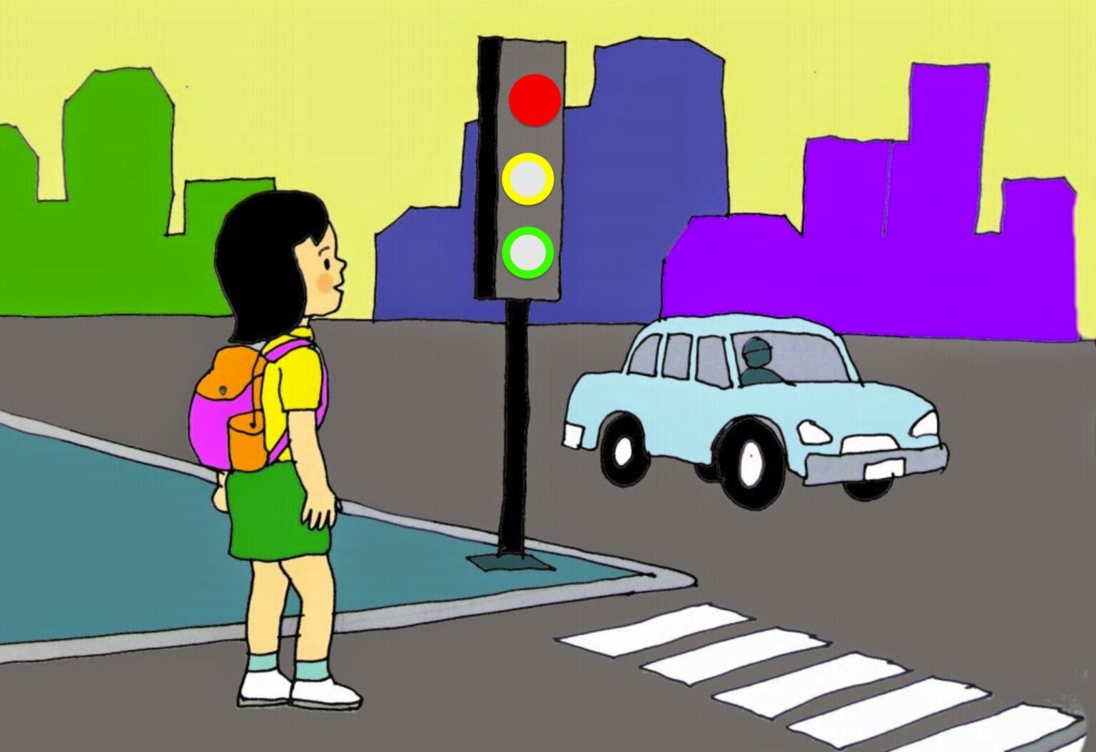 – Các cháu có nhìn thấy tín hiệu đèn đỏ kia không? Khi nào đèn đỏ tắt, đèn xanh bật lên các cháu mới được qua đường nghe chưa nào!